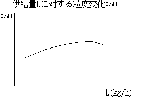 供給量の変化に対しては粒度変化は在るものの、外乱程度だと言えます。 但し、特に微粉砕領域では、供給量を減らして行くと微粉が得られます。 |